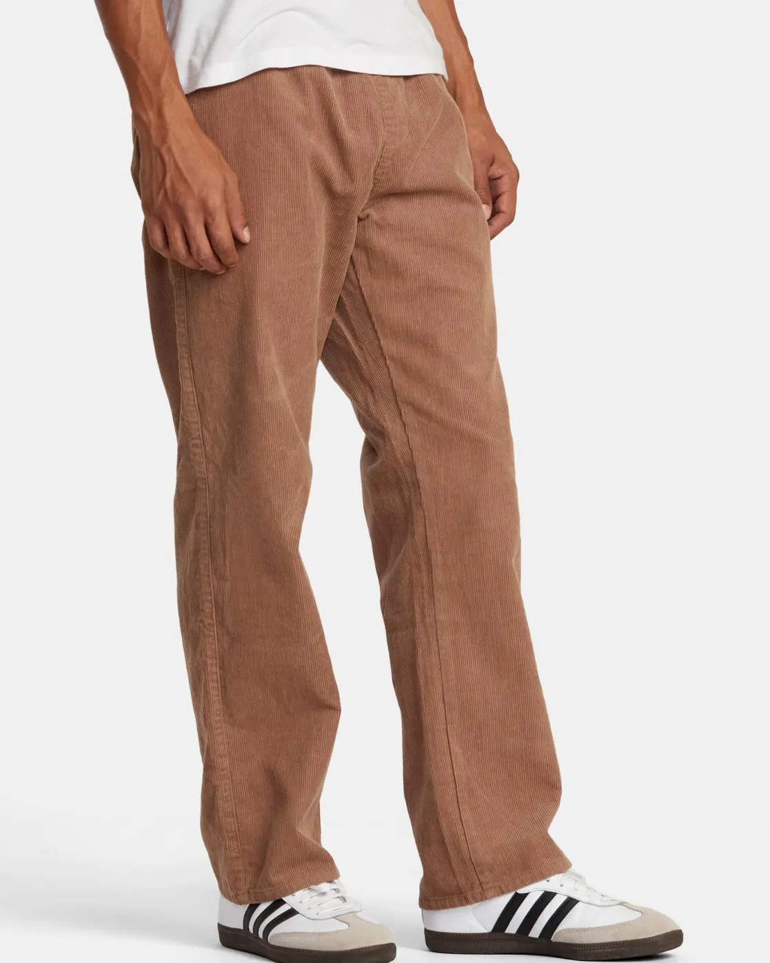 The RVCA Americana Elastic Waist Cord Pants give you comfort and style in one. Designed in a relaxed fit, these men’s corduroy pants feature an Elastic Waist, internal drawcord, faux fly, pockets throughout, reinforced seams and woven RVCA branding. Featured here in the Sonora Brown colorway.