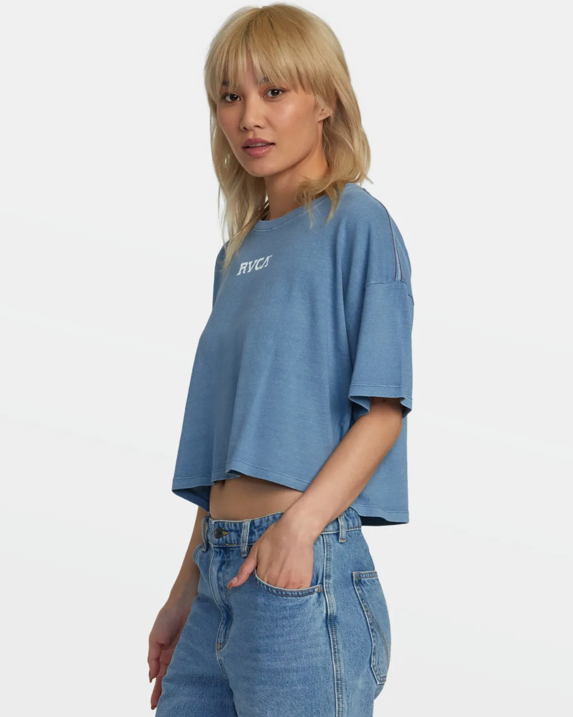 A simple tee that feels broken-in from day one. The cropped, boxy fit and short sleeves make a perfect pair with your favorite high-waisted shorts or denim, while the lightweight cotton jersey fabric keeps you comfortable all day. Featured here in the Coronet Blue colorway.