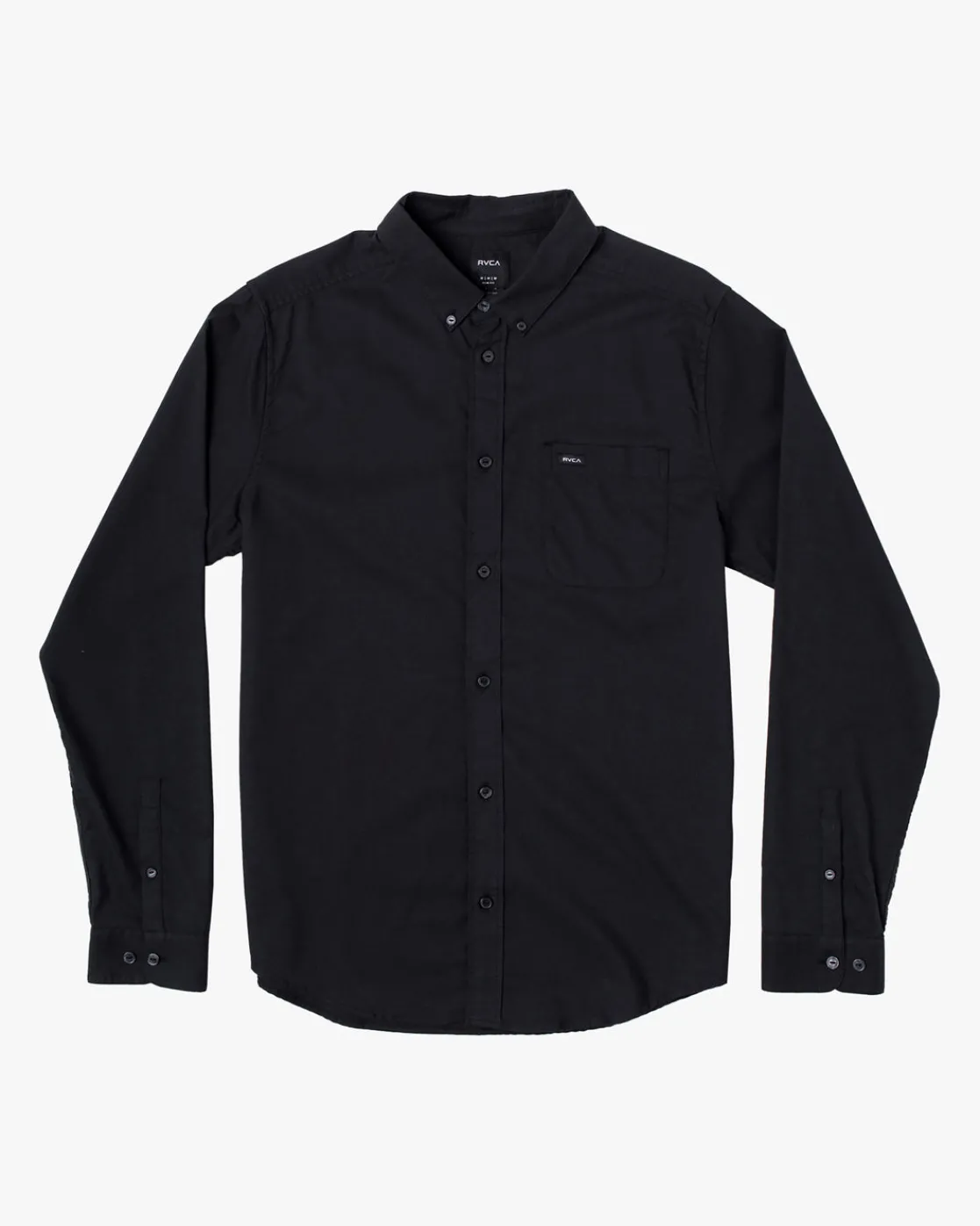 Experience all-day comfort with RVCA’s That’ll Do Stretch Long Sleeve Shirt for boys: a blended cotton button-down shirt with a slim fit, collar neck, chest pocket, and an RVCA solo label for an elevated finish. Featured here in the Black colorway.