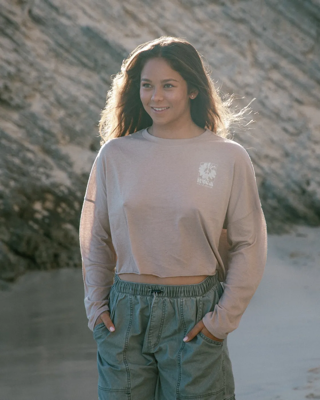 The Cloud Long-Sleeve T-shirt from RVCA keeps you comfy with its cropped, boxy fit. Made from soft and lightweight blended cotton, this pigment-dyed tee has a relaxed, drop-shoulder shape and screened RVCA graphics adding laid-back style. Featured here in the Warm Taupe colorway.