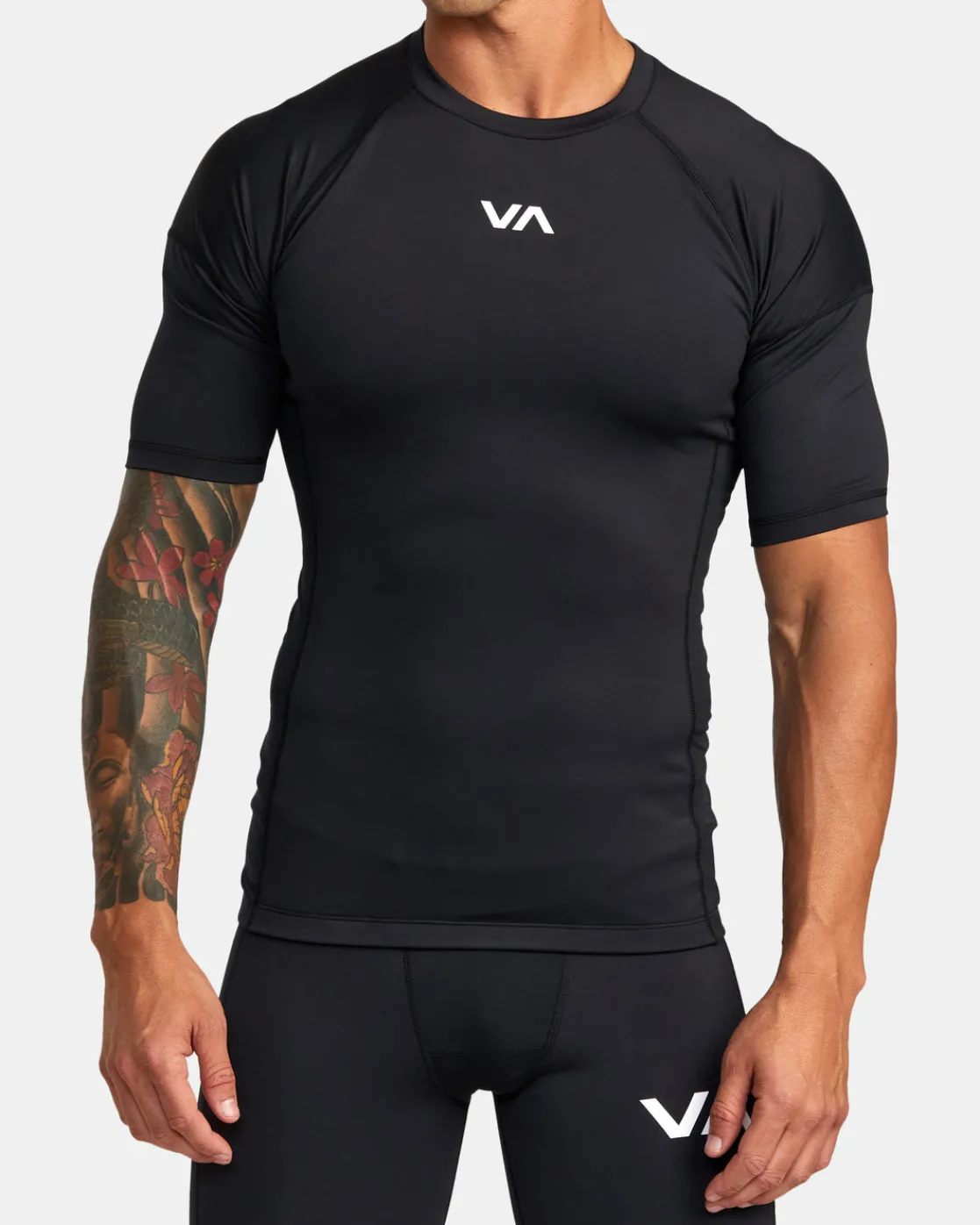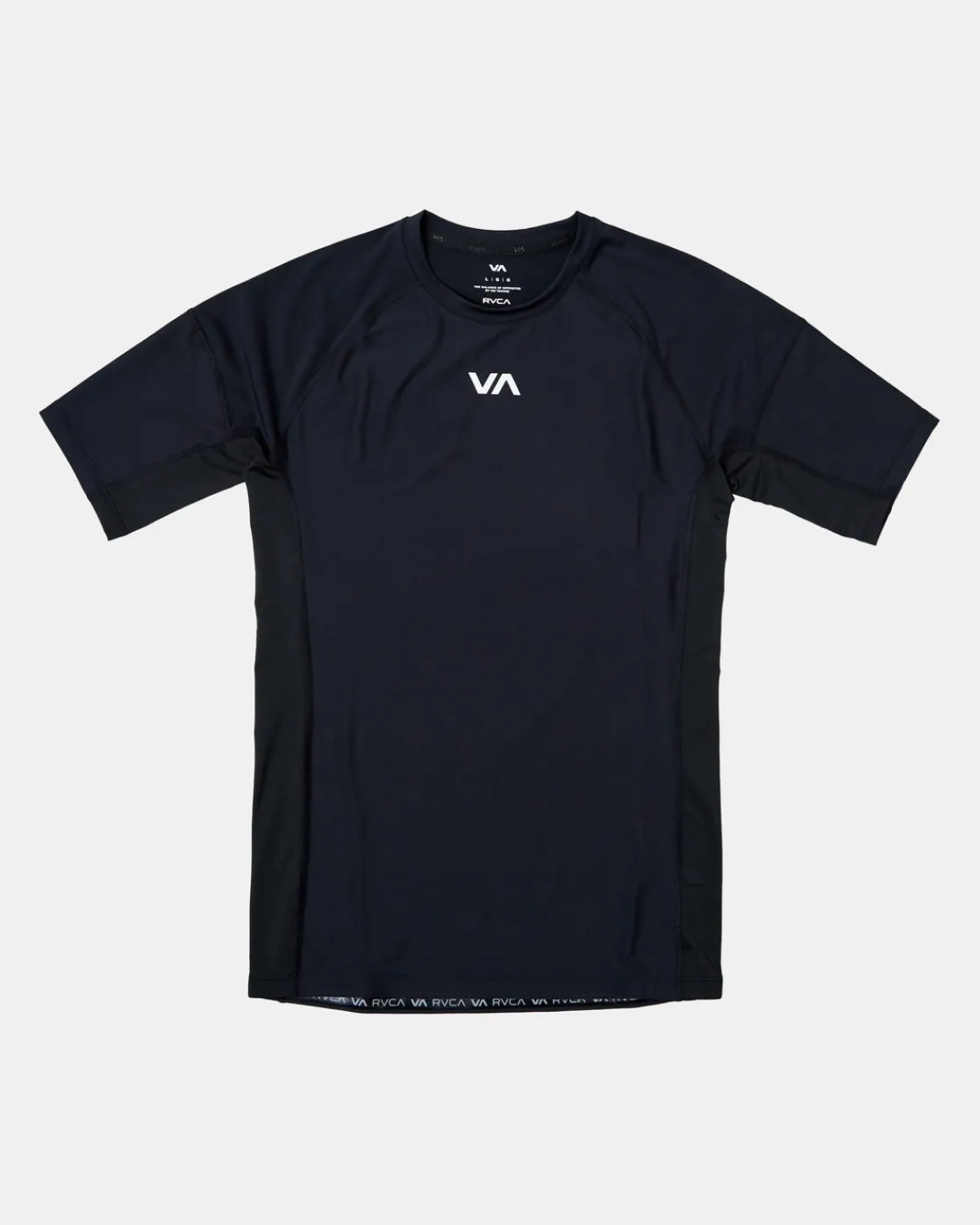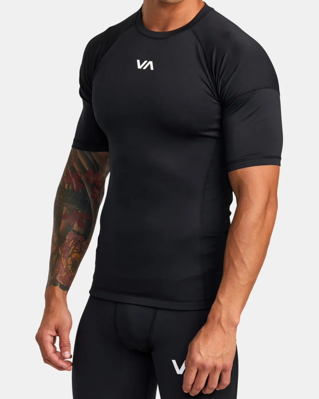 Made of 4-way stretch recycled fabric, this VA Sport technical compression top is antimicrobial and moisture-wicking to keep you feeling fresh and dry while you train. Featured here in the Black colorway.