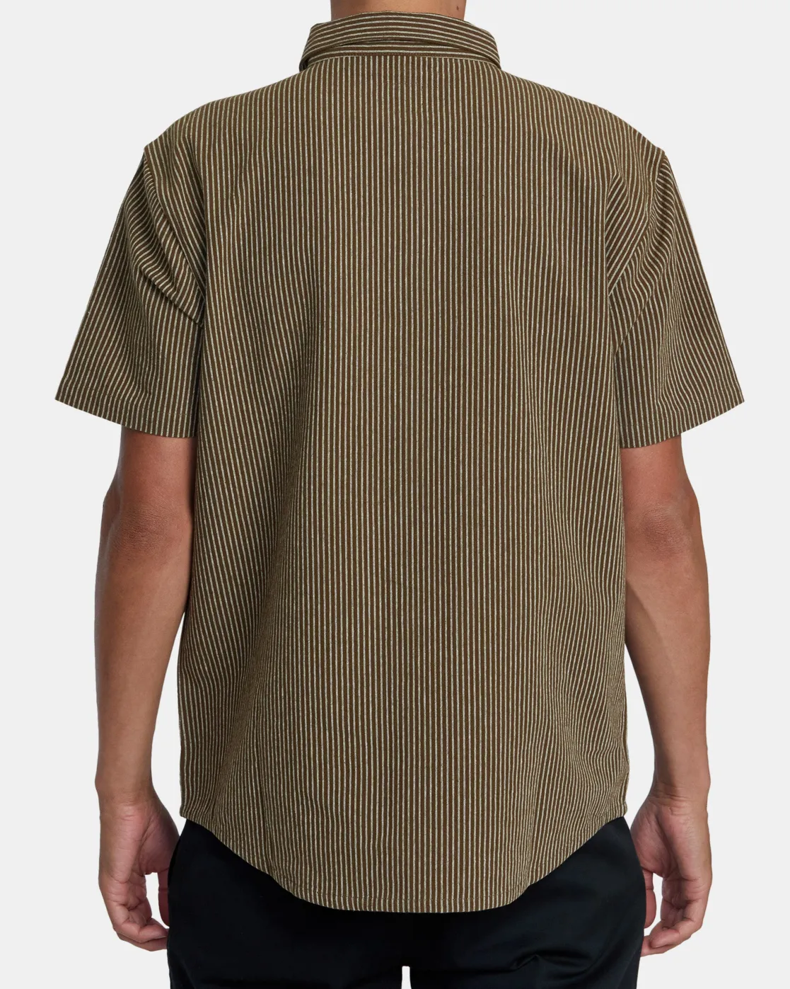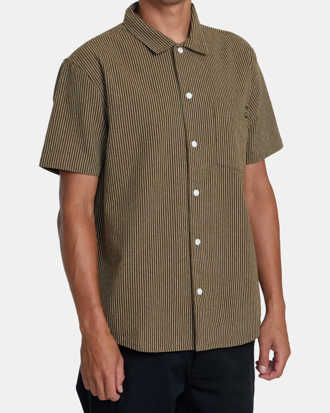 Revitalize your wardrobe with RVCA Dayshift Collection’s Dayshift Stripe II Short Sleeve Woven Shirt. Pairing timeless design, clean lines, and modern fabrication, this button-up men’s shirt features a relaxed fit, yarn-dye stripes, a single chest pocket, and a scallop hem. Featured here in the Bombay Brown colorway.
