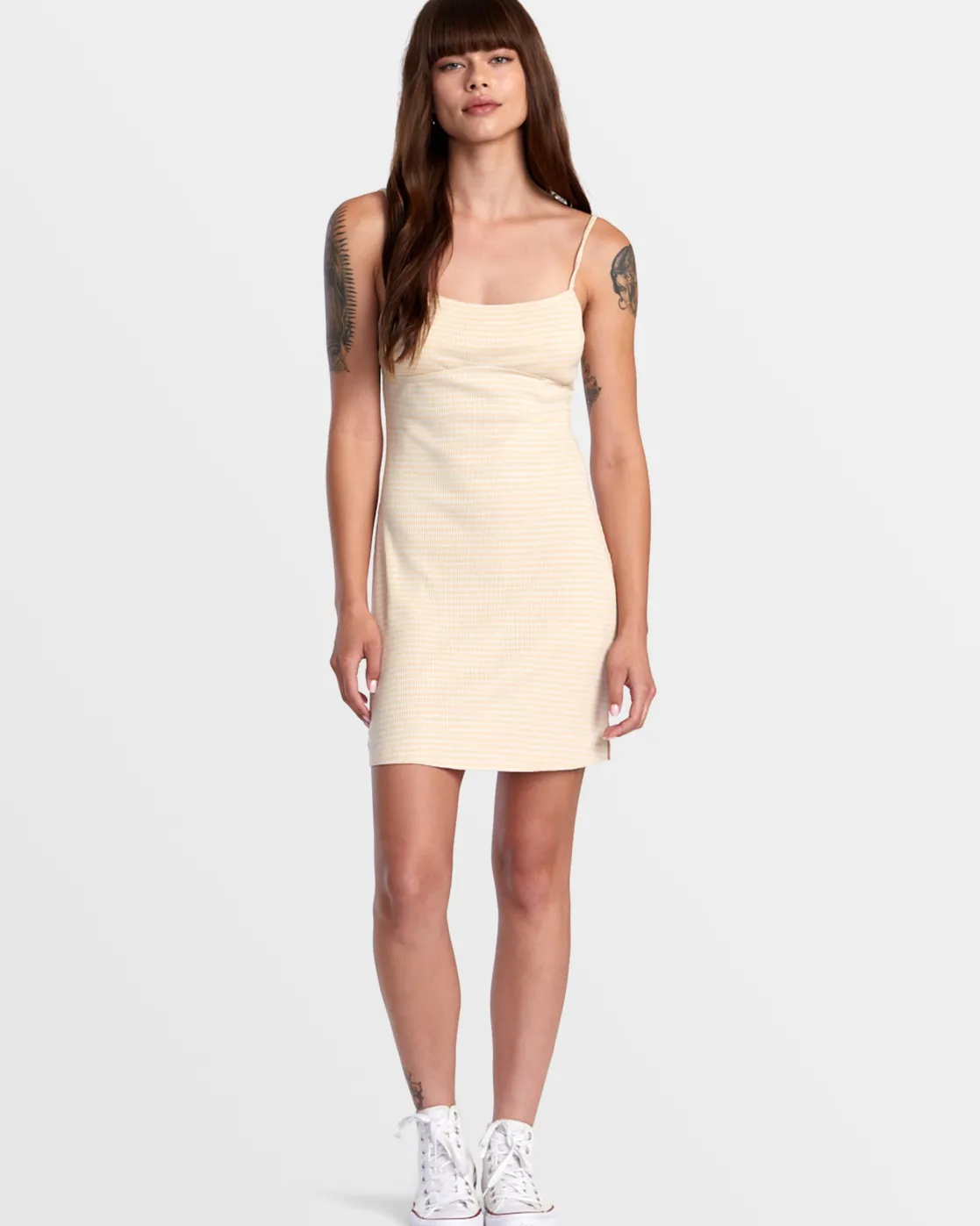 Crafted of rib knit fabric, RVCA Women’s Dixie is a fitted mini dress with a scoop neck and a flattering bust seam to define your shape. Complete with a strappy back design, its tonal stripes give it an oh-so-wearable everyday style. Featured here in the Latte colorway.
