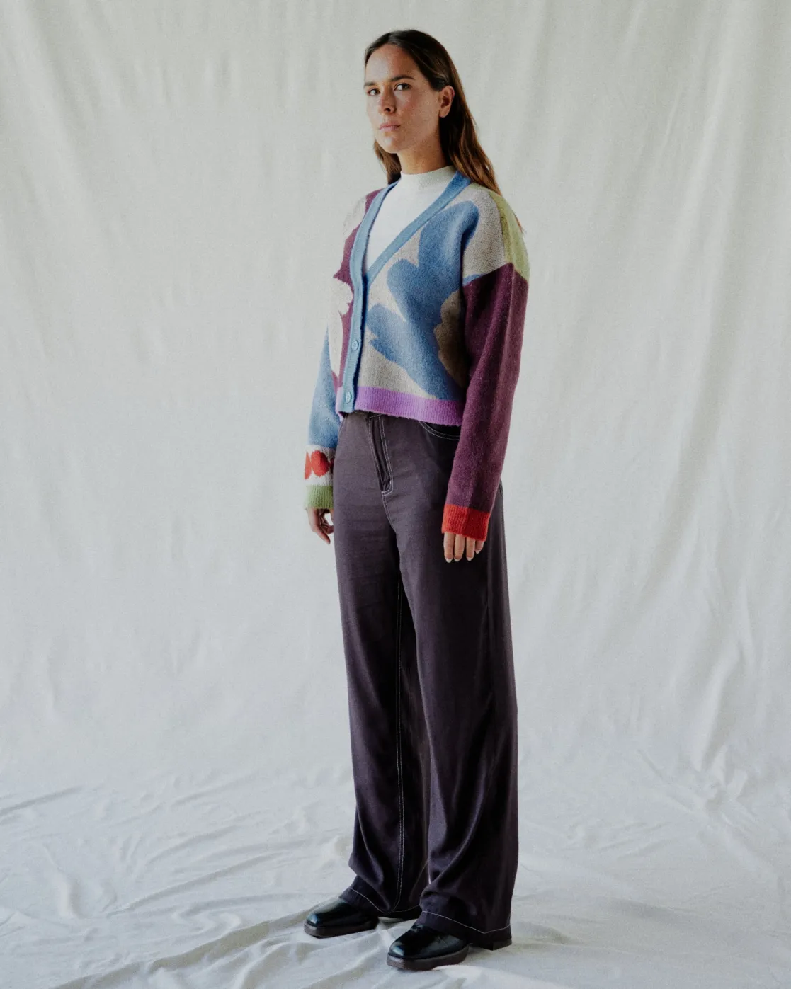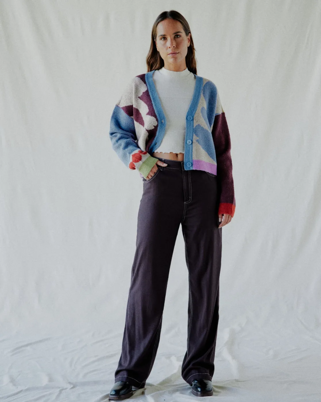 This cozy, boxy cardigan from the Gabrielle Monceaux collection summons fall in a soft blended knit with woven artwork. Button closures, long sleeves, and a V-neck make it a versatile you can layer over all your favorite tees and tanks. Featured here in the Ecru colorway.