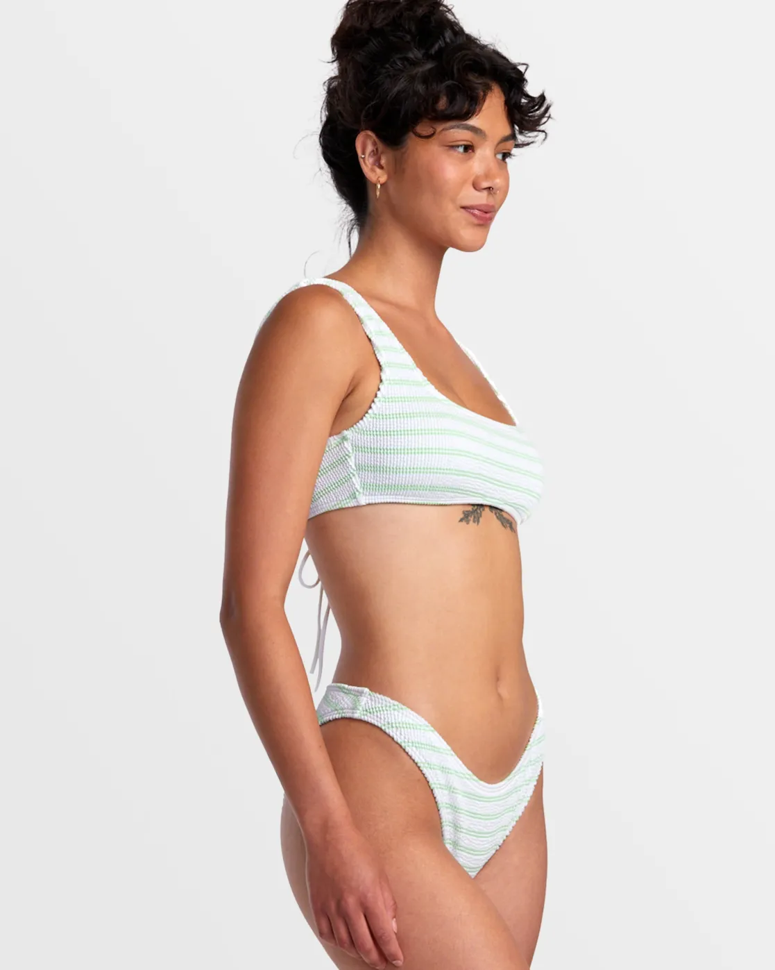 This medium-coverage bikini bottom from RVCA’s Grooves Stripe swim collection combines a high leg and a mid-rise waist. Best worn high on the hip to compliment your curves, it features a yarn-dyed stripe pattern on partially recycled texture fabric. Featured here in the Whisper White colorway.