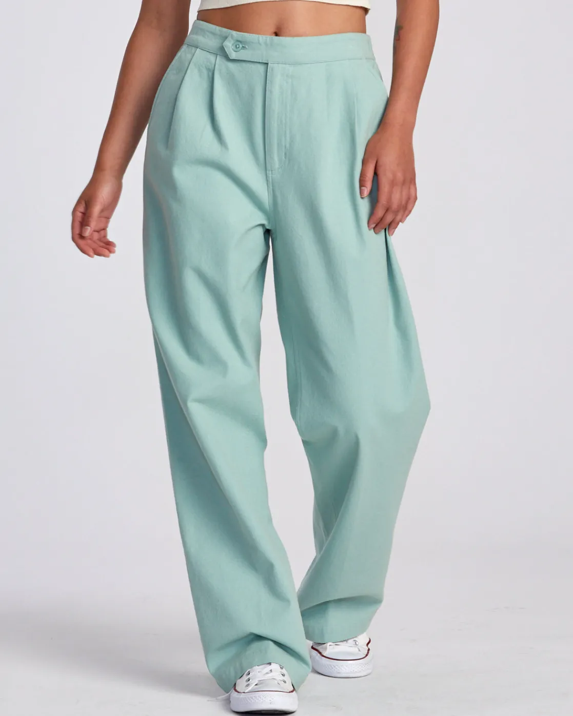 Discover RVCA Women’s Hudson Wide Leg Pants, crafted from cotton corduroy fabric with a high waist and a loose fit through the legs. Adding pleats at the front for an elevated look and an elastic waist at the back for a comfortable fit, these versatile pants are perfect for any occasion. Featured here in the Green Haze colorway.