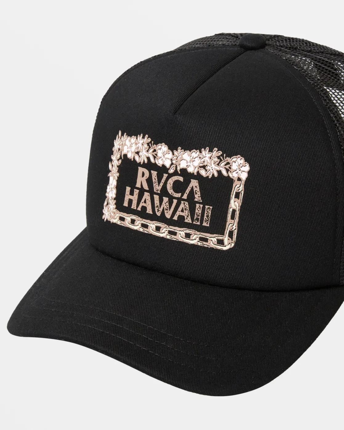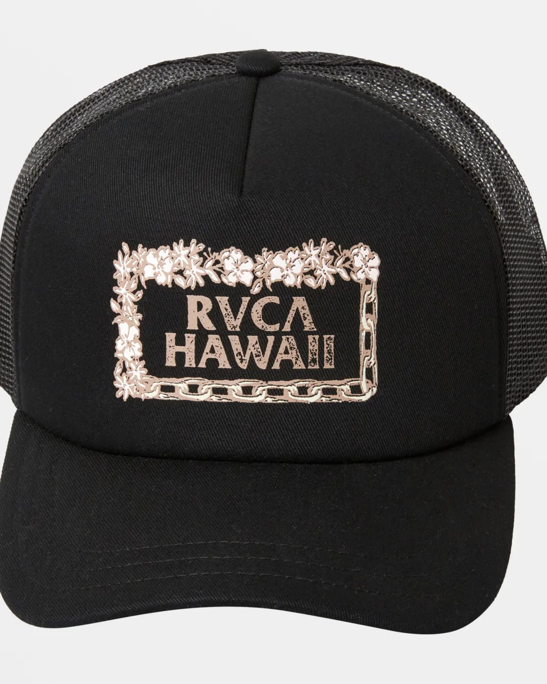 An island-inspired snapback cap for your next beach day. Crafted from lightweight and breathable polyester cotton with a mesh back, the curved bill keeps the sun out of your eyes whether hiking the tropics or daydreaming of palm trees. Featured here in the Rvca Black colorway.