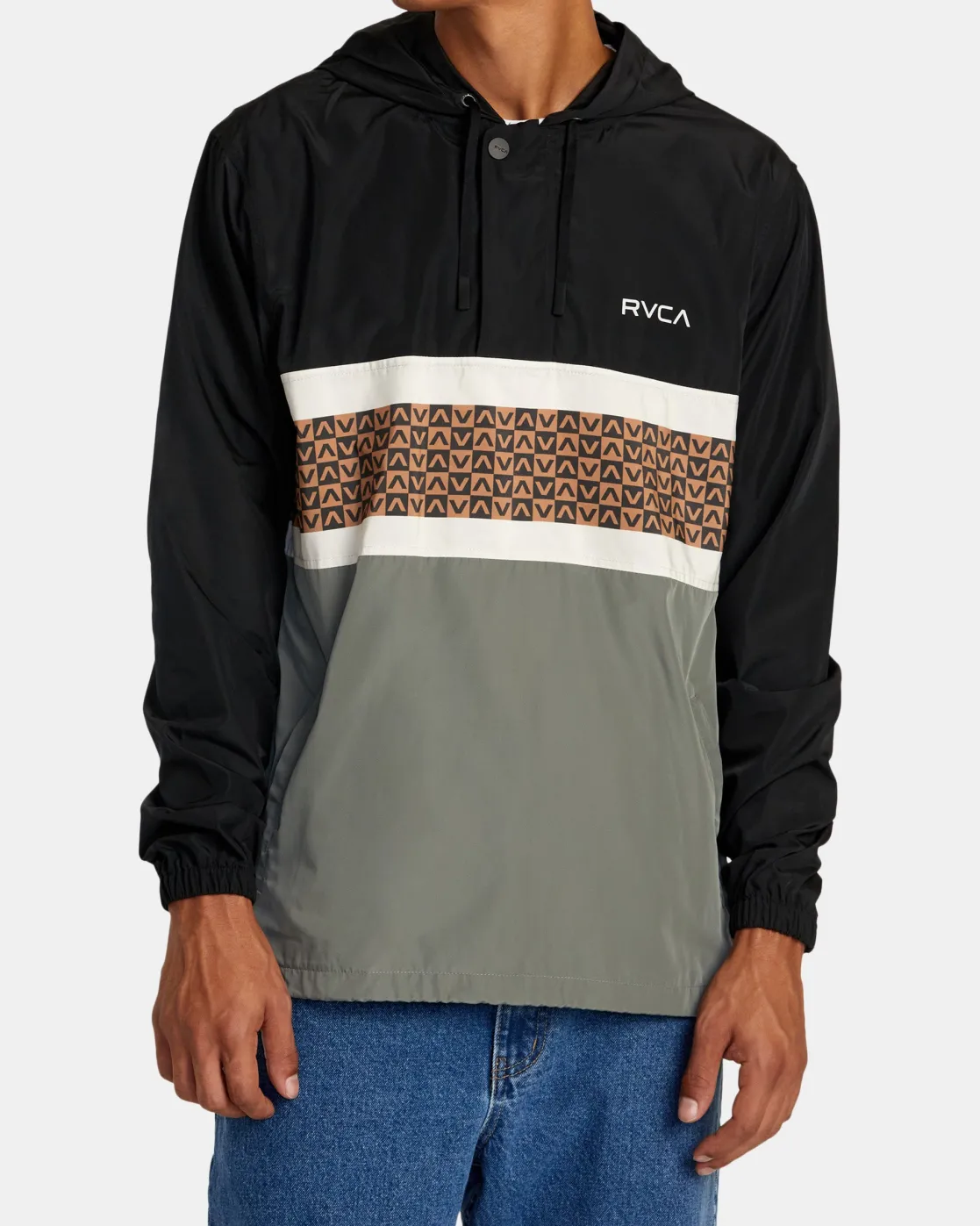 The Meyer II lightweight anorak jacket from RVCA delivers protection from the elements with functional features and sporty style. The polyester taffeta fabric has a water-resistant coating for protection from wind and light rain, while the extended hood collar and long sleeves provide coverage. A center front half zipper with placket and two hidden zip pockets keep essentials secure. Featured here in the Black colorway.