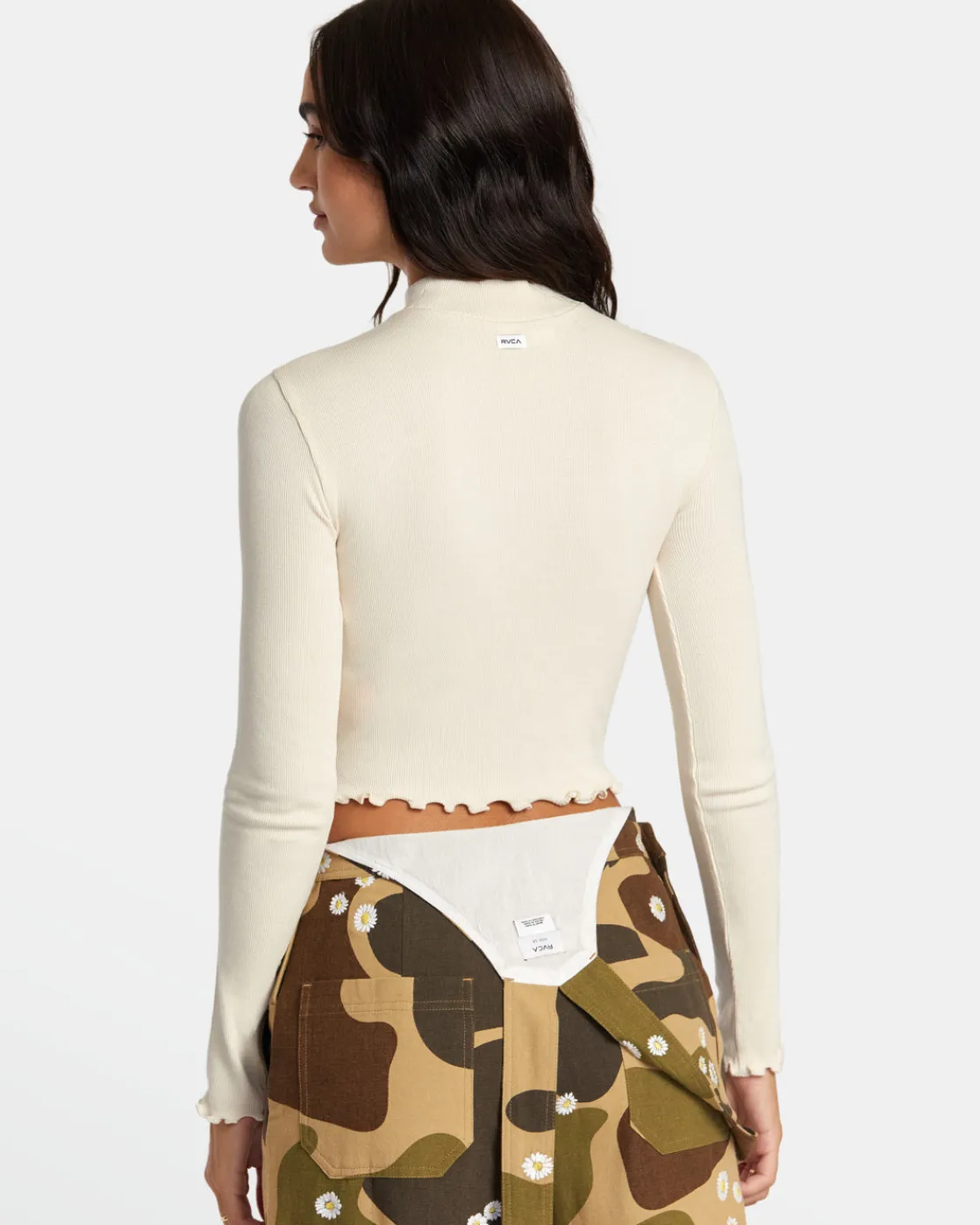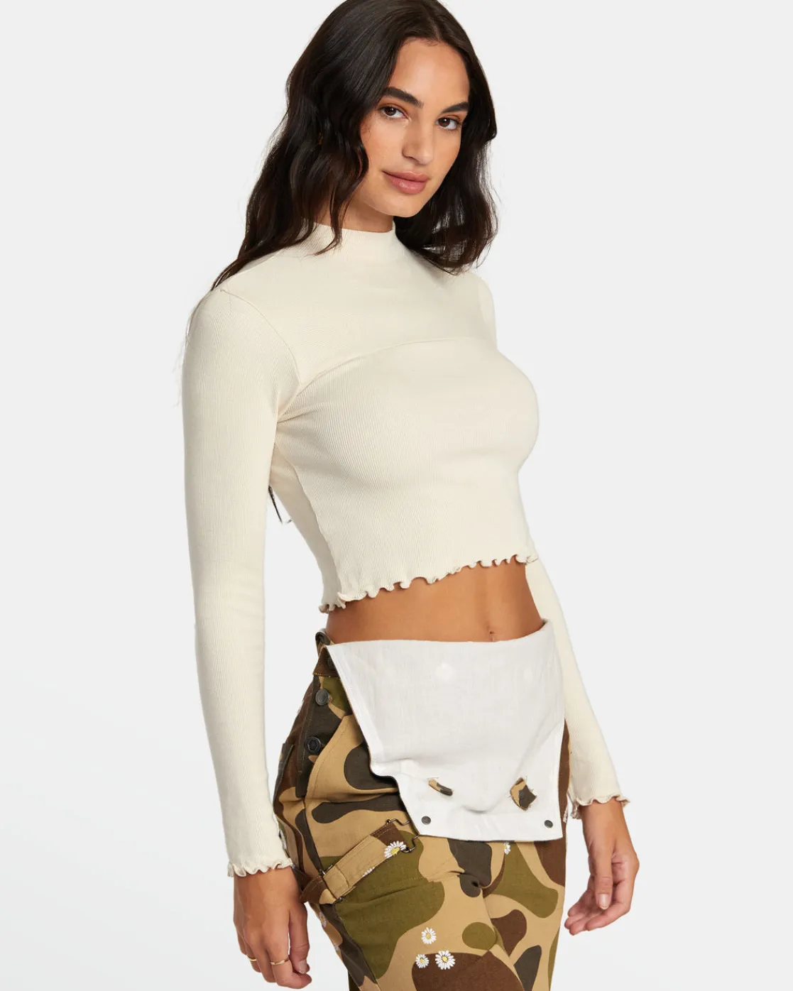 Made of ribbed stretch-knit fabric, this long-sleeve cropped top has a fitted shape with a mock neck, a lettuce hem, and seaming detail across the chest. Featured here in the Latte colorway.