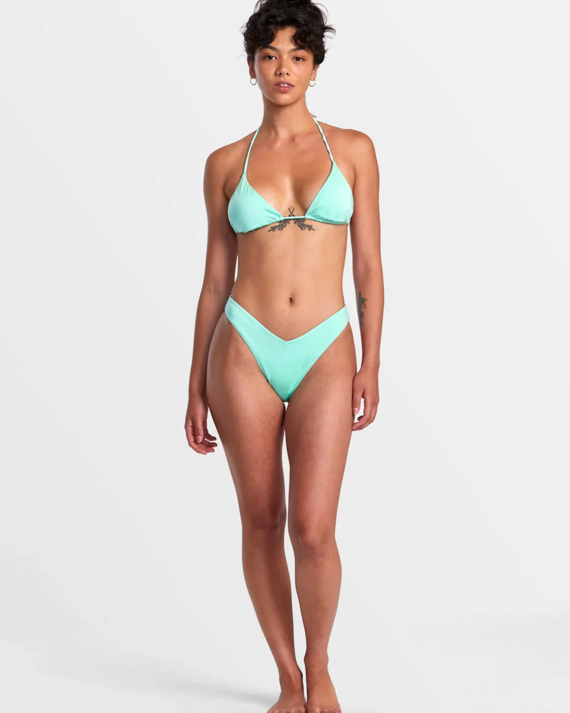 Shine like the sun in our RVCA Solid Shimmer Tri Bikini Top. With its high-sheen partially recycled fabric and halter tie straps, this slide triangle swim top stands out among the rest. Featured here in the Ice Green colorway.