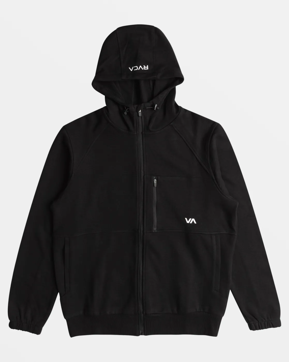 Go for solid comfort and solid vibes in the RVCA Tech Zip-Up Fleece Hoodie II. Made from soft cotton poly with fleece, this zip-up sweatshirt features an adjustable hood, long sleeves with elastic cuffs, ribbed hem, pockets throughout and VA Sport Collection branding. Featured here in the Black 2 colorway.