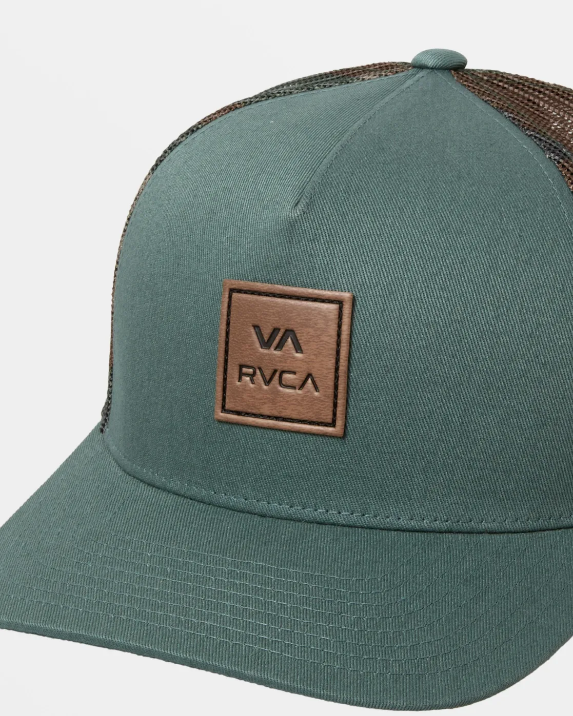 The RVCA VA All The Way Curved Brim Trucker Hat takes a classic design and flips the script. Made from soft poly twill with mesh backing, this 5-panel trucker hat features a curved brim for a modern look, snapback closure and logo branding throughout. Featured here in the Balsam Green colorway.