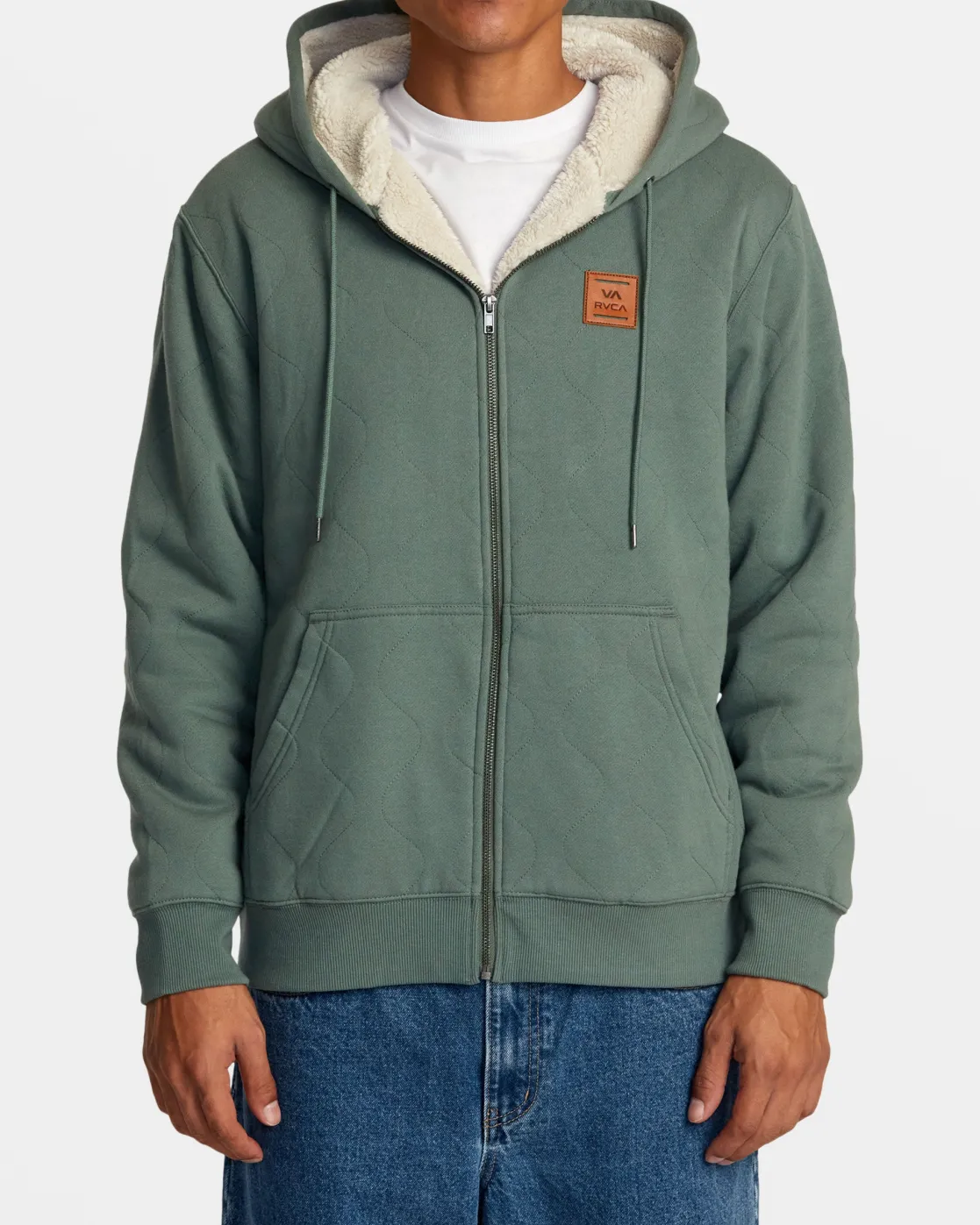 A sherpa-lined zip-up hoodie should always be a staple in your closet. And this one comes with an RVCA chest patch, a split kangaroo pocket, and a quilted outer shell. Featured here in the Jade colorway.