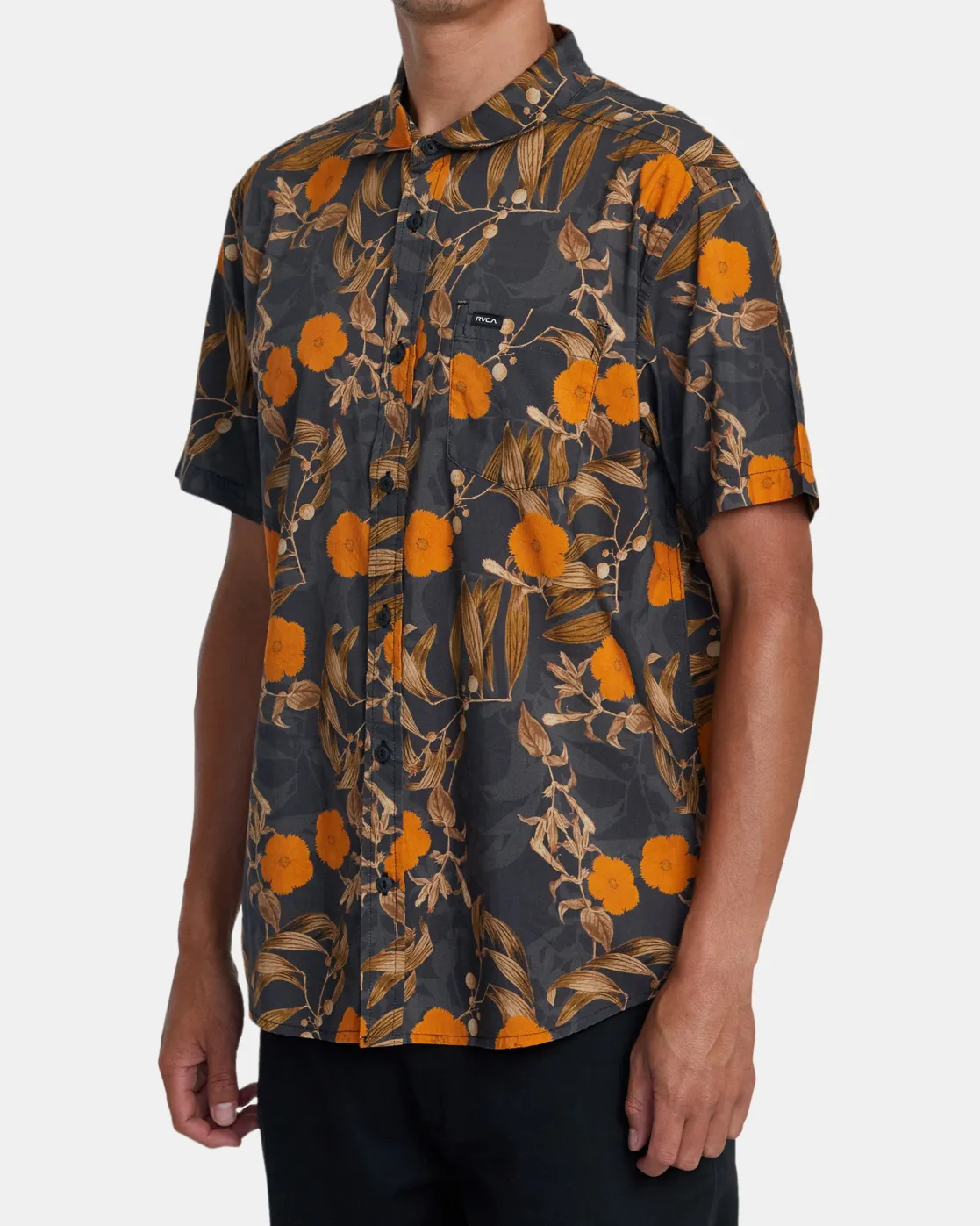 Experience easy summer style with RVCA’s Botanical printed short-sleeve woven shirt. Made from a premium blend of cotton and viscose to keep it feeling soft and light, this regular-fit shirt features a classic collar, a single chest pocket, and a scalloped hem. Featured here in the Black colorway.