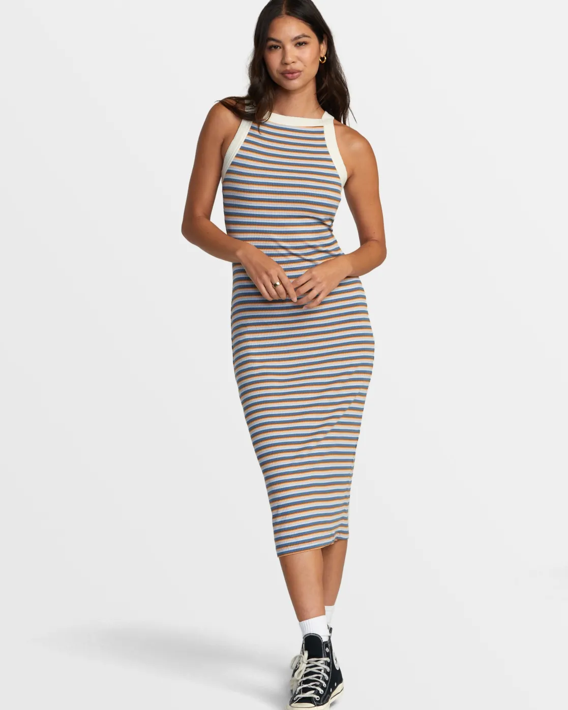 This chich midi dress emits a carefree vibe thanks to the slinky viscose blend fabric and figure-hugging shape. The crew neck and fixed straps make for an easy throw-on style, while the midi length makes it versatile for casual weekend wear or city nights out. Featured here in the Multi colorway.