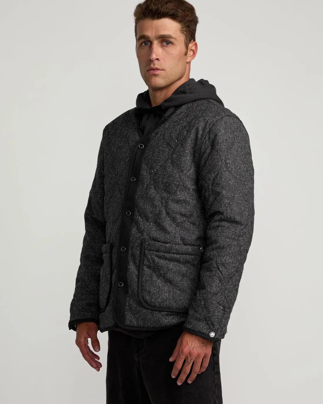 The Chef Kiss jacket from RVCA’s Benjamin Jeanjean x Andrew The Kid collection channels military vibes with its boxy cut and relaxed fit. Lightly quilted for comfort and warmth, it features patch pockets and an RVCA metal snap closure for a stylish look fit for cruising the city streets.