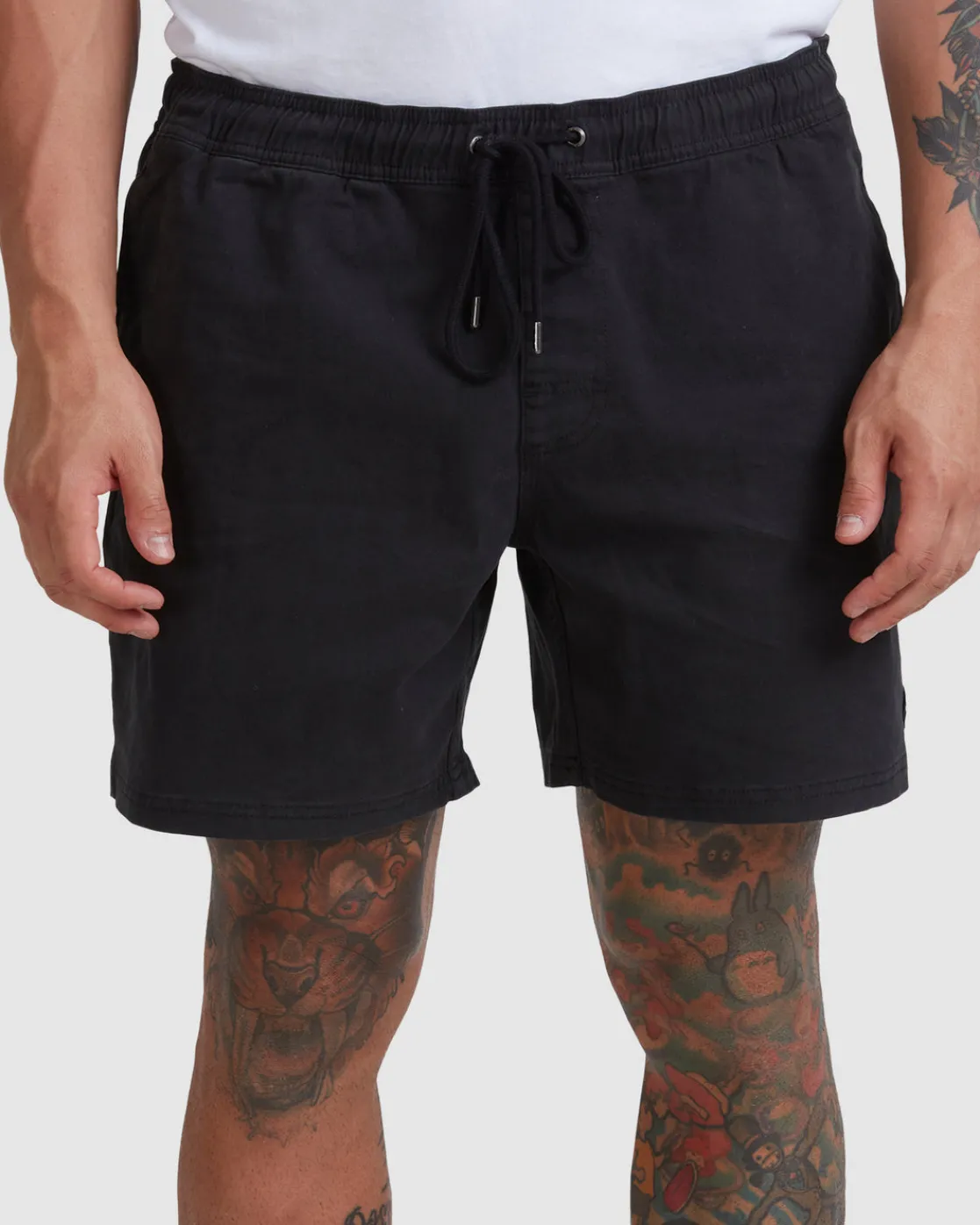 A solid short that won’t hold you back, the RVCA Escape Elastic Waist Short features a comfort-driven design with functional stretch. A solid Elastic Waist short, the Escape keeps to utilitarian lines with a drawcord a the waist, side seam pockets, and a back pocket with a RVCA woven label. A heavy enzyme wash offers the short a broken-in look and feel. Featured here in the Black colorway.