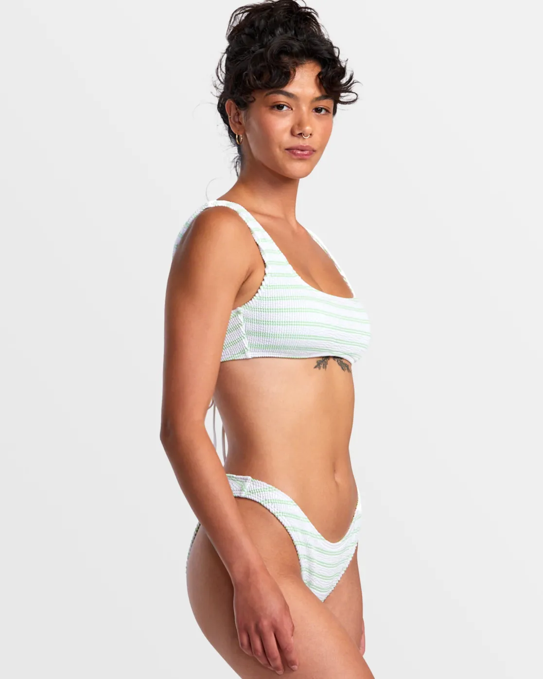 Sleek and sporty, RVCA’s Grooves Stripe Laceback Bralette Bikini Top features a scoop neck and a lace-up back tie to customize the fit. Crafted of partially recycled texture fabric, this solid swim top is a perfect choice for active beach days. Featured here in the Whisper White colorway.