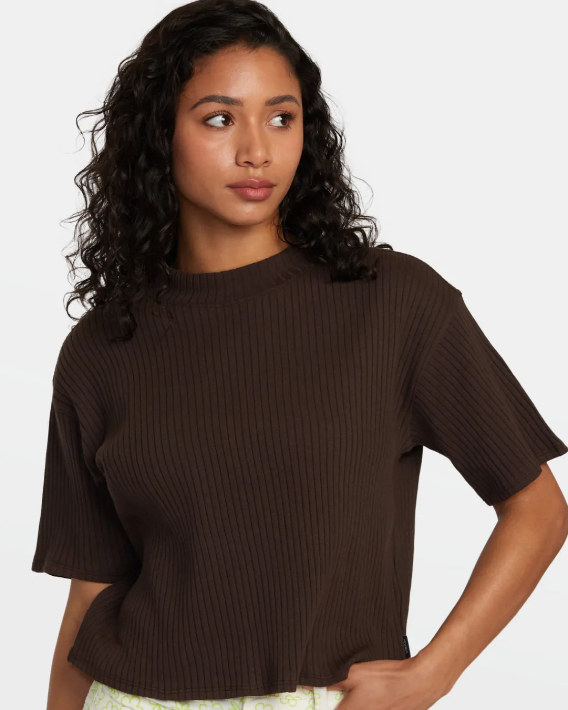Part of RVCA Women’s Select’s Collection, the Kinney II Tee is elevating a classic crew neck with wide rib knit fabric and a slight mock neck. The boxy fit adds a modern edge. Featured here in the Java colorway.