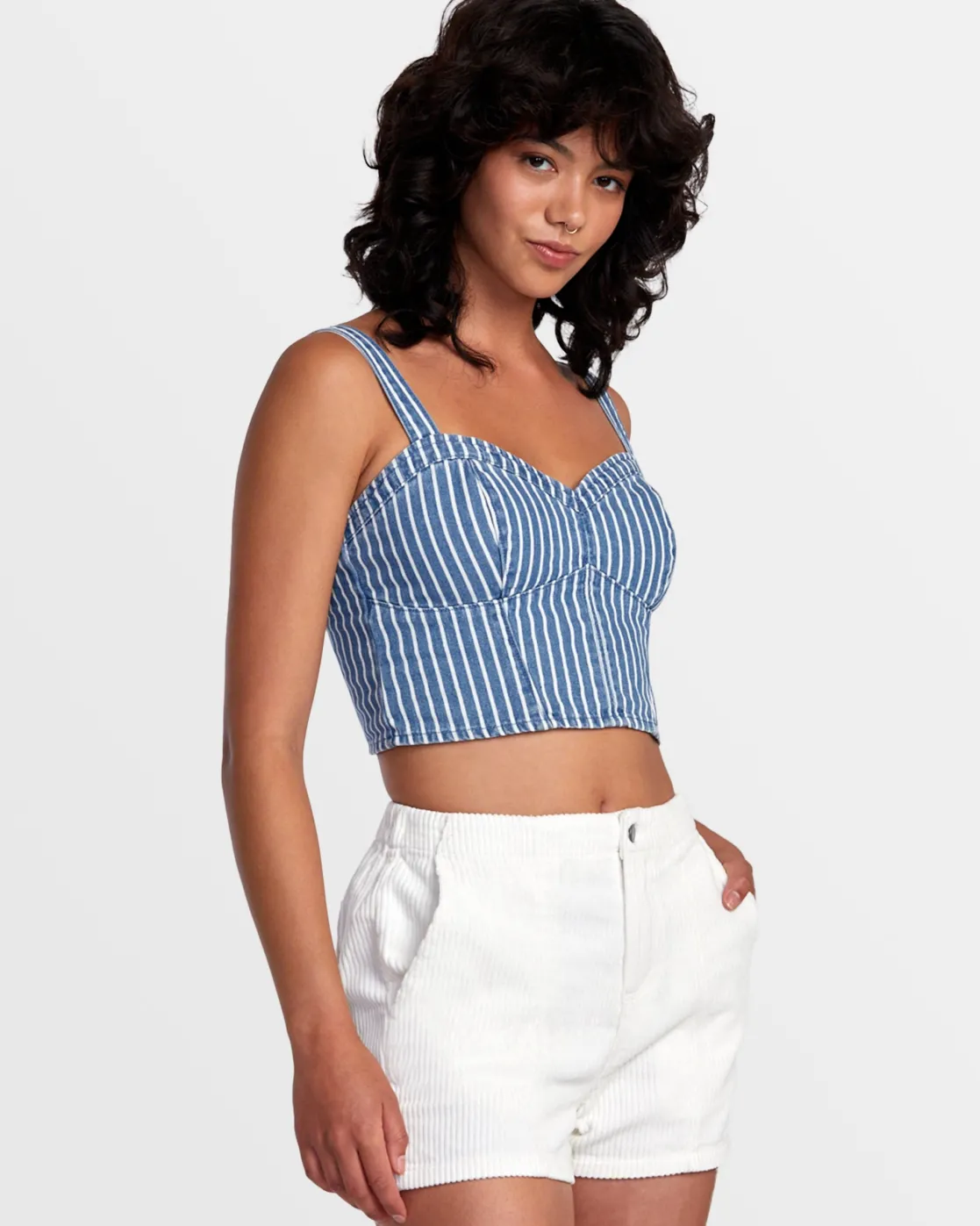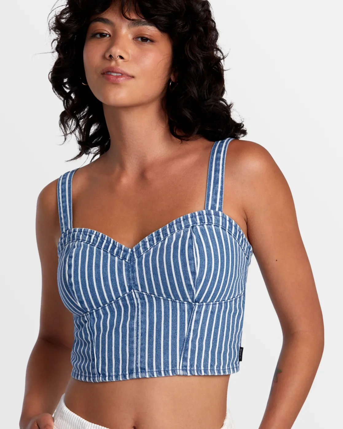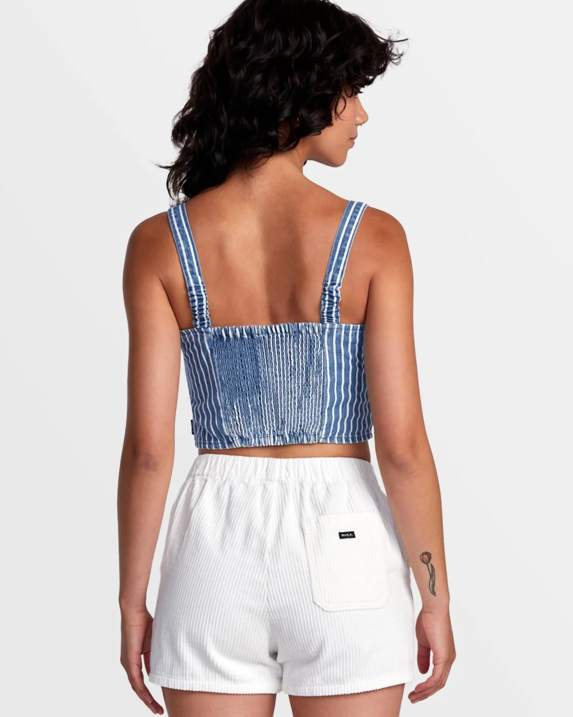 Made from lightweight cotton denim, RVCA’s Portia pinstripe crop top has a fitted, corset-inspired shape with flattering seam detail and a smocked back. Featured here in the Washed Indigo colorway.